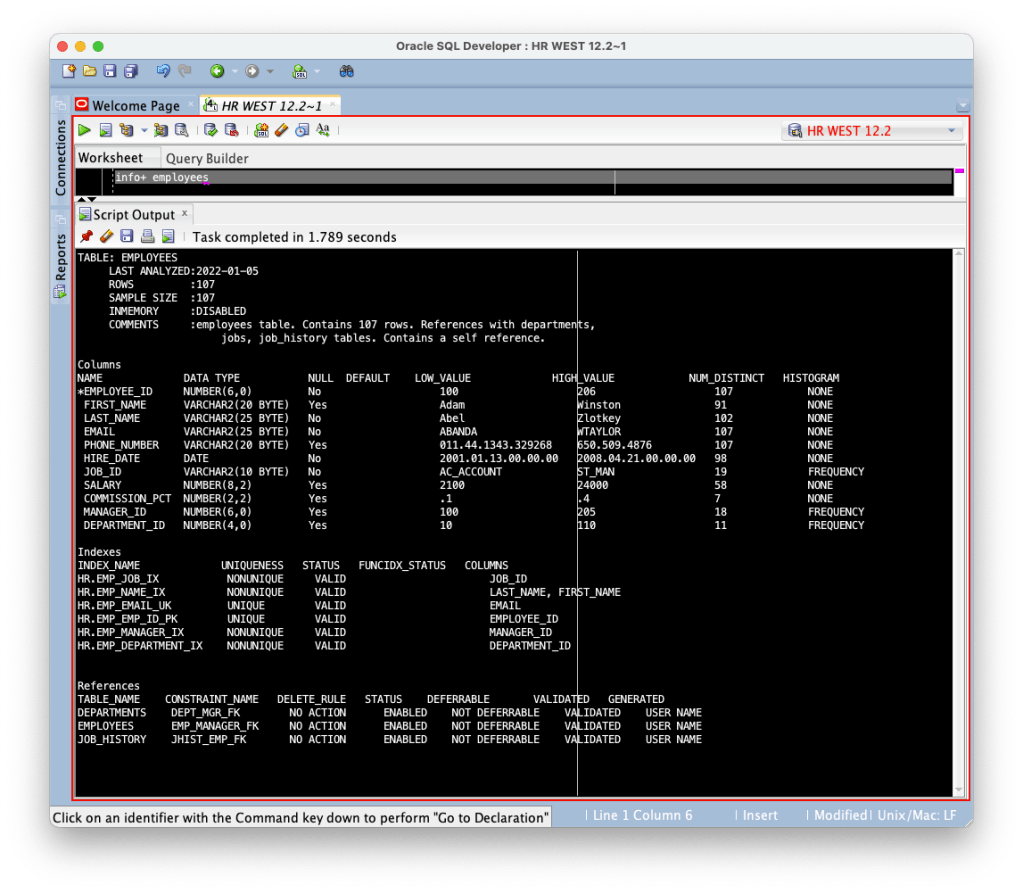 There are several different ways we can do that, but I find the easiest and quickest way to check this is using SQL Developer in conjunction with SQLcl commands. It also gives you all the indexes, columns, and references.