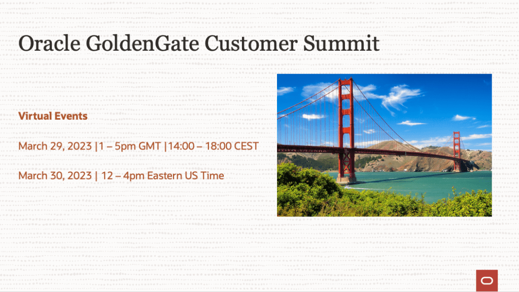 Our Spring Summit will be a 4hr webinar packed with the latest updates about Oracle GoldenGate and Stream Analytics, featuring customer stories, live demos, and a roadmap for the future of Data Fabric and Data Mesh architectures. We look forward to hosting you at this highly informative event.