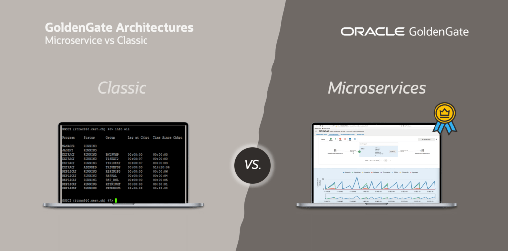 | User interface | Command line and text files (ggsci) | Web-based GUI, AdminClient and REST API |