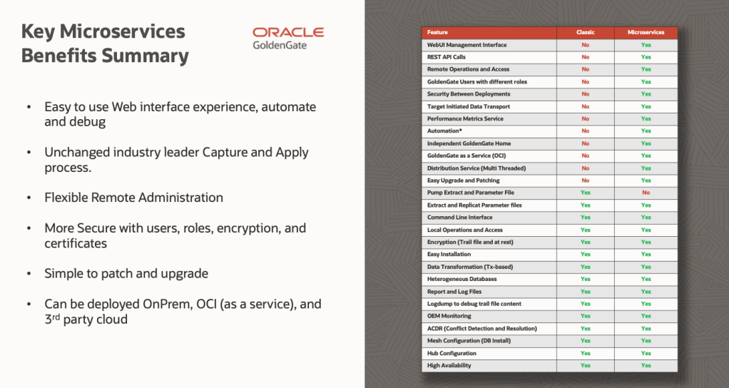 | Feature | GoldenGate Classic | GoldenGate Microservices |
