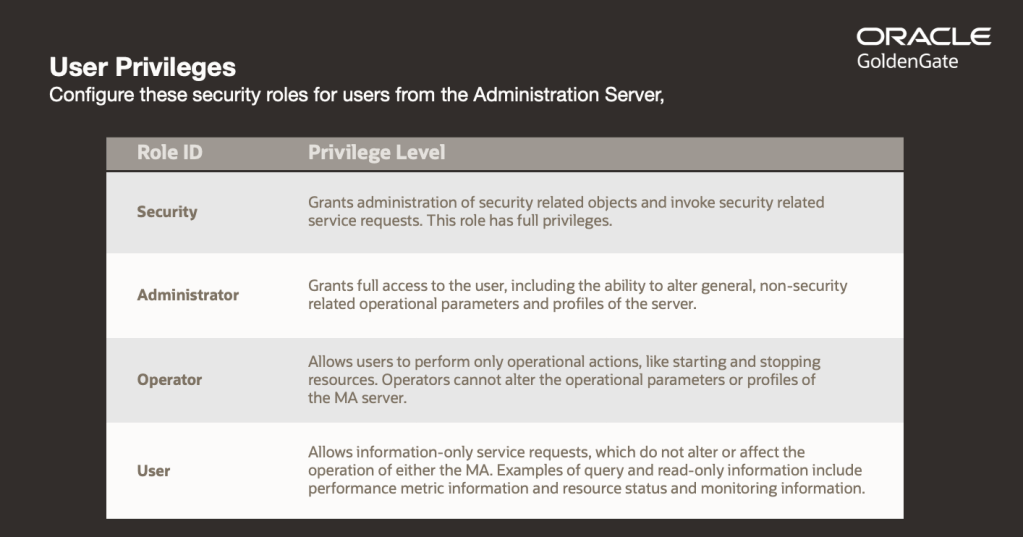 User management: Microservice’s different role-level access can be granted to GoldenGate users.