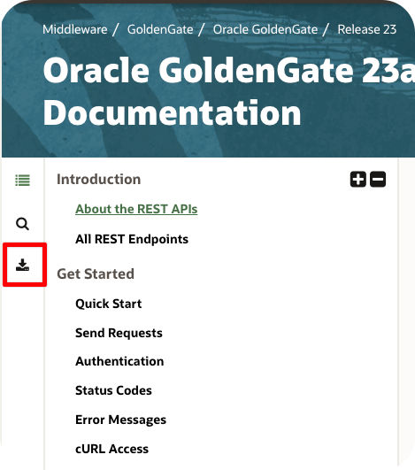 GoldenGate’s REST API documentation includes a link to download the official Swagger (OpenAPI) specification file.