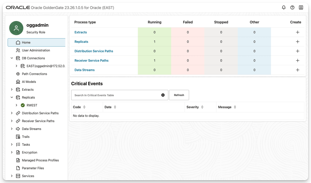 GoldenGate EAST → https://localhost:8080 (oggadmin / Welcome##123)