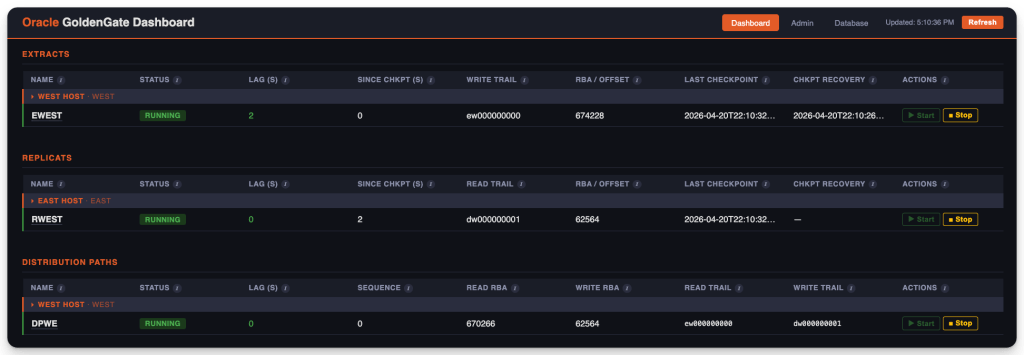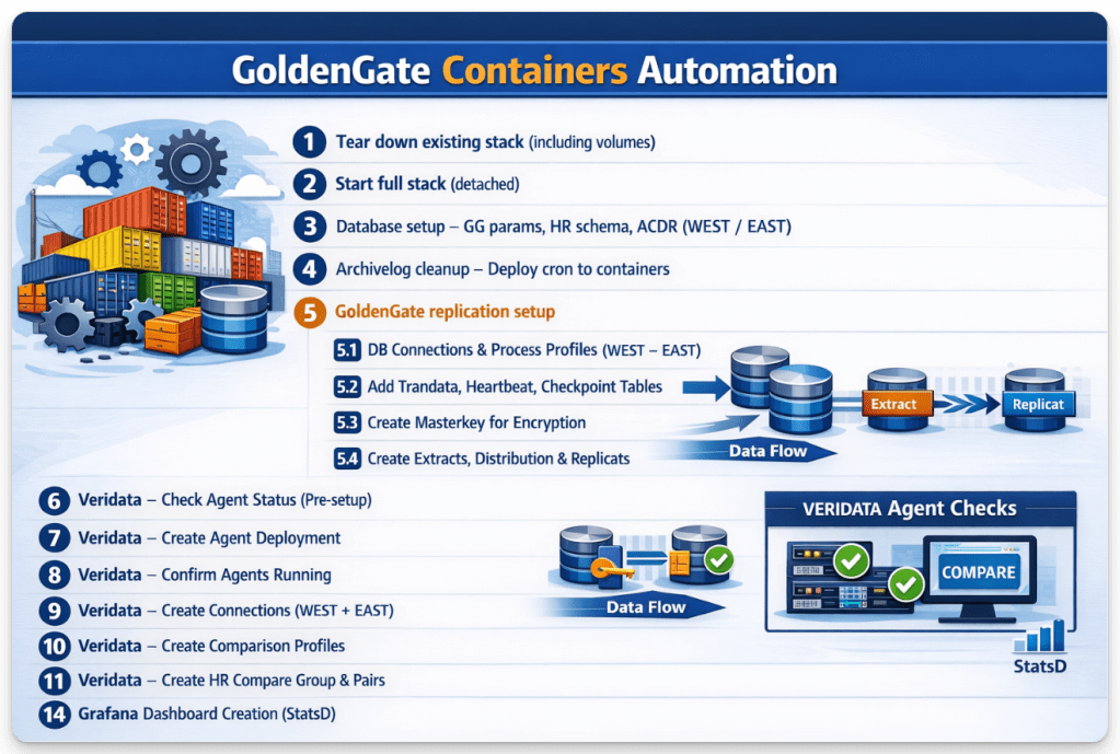 GoldenGate Containers Automation brings together Docker orchestration and API-driven workflows to deliver a fully repeatable, end-to-end data replication environment. From tearing down and rebuilding the entire stack to configuring databases, enabling replication, and validating data consistency, every step is streamlined into a cohesive automated flow. The process doesn’t stop at setup it extends into operational excellence with scheduled Veridata comparisons and integrated monitoring through Grafana, giving clear visibility into system health and data accuracy across WEST and EAST environments.