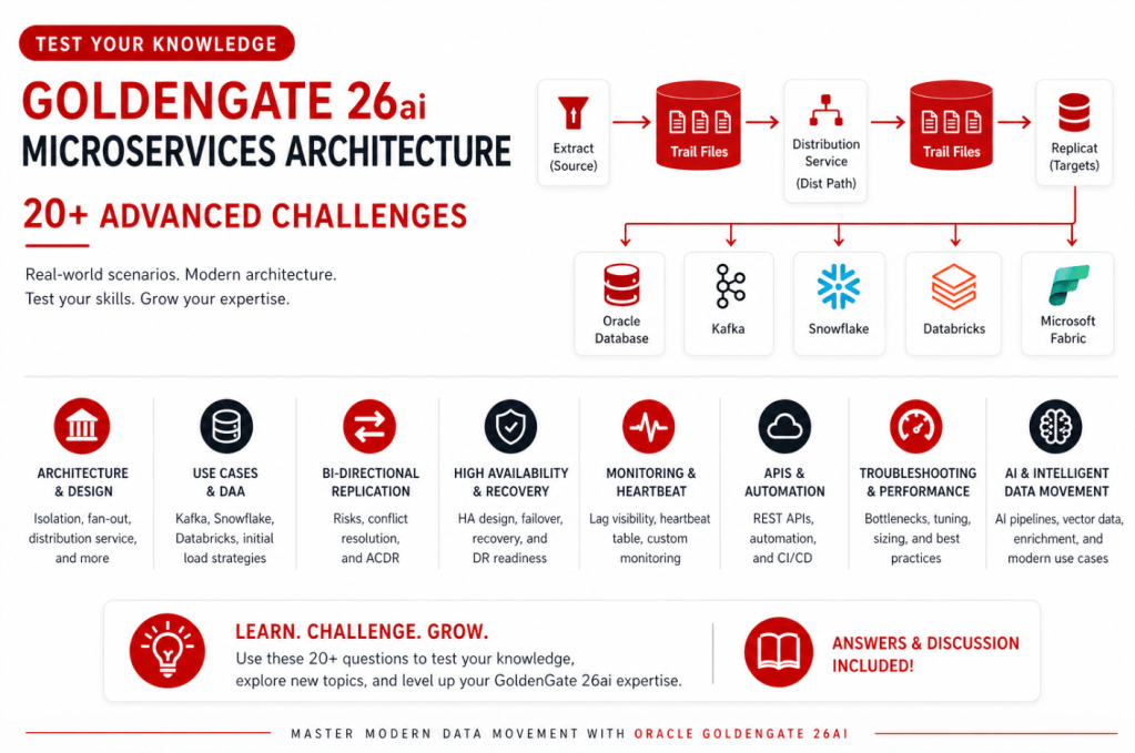 These are not beginner questions. They reflect real-world scenarios I’ve seen with users working with Oracle GoldenGate 26ai Microservices Architecture; from bi-directional replication and high availability to Data Streaming and modern data platforms like Kafka, Snowflake, and Databricks.